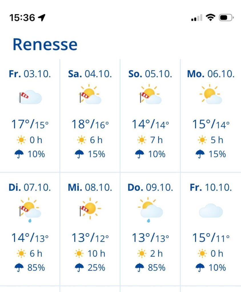 Hier regnet es sein Sonntag gefühlt ununterbrochen, so dass wir uns mal den Wetterbericht für Renesse im Oktober angeschaut haben. So ganz schlecht sieht es eigentlich gar nicht aus: