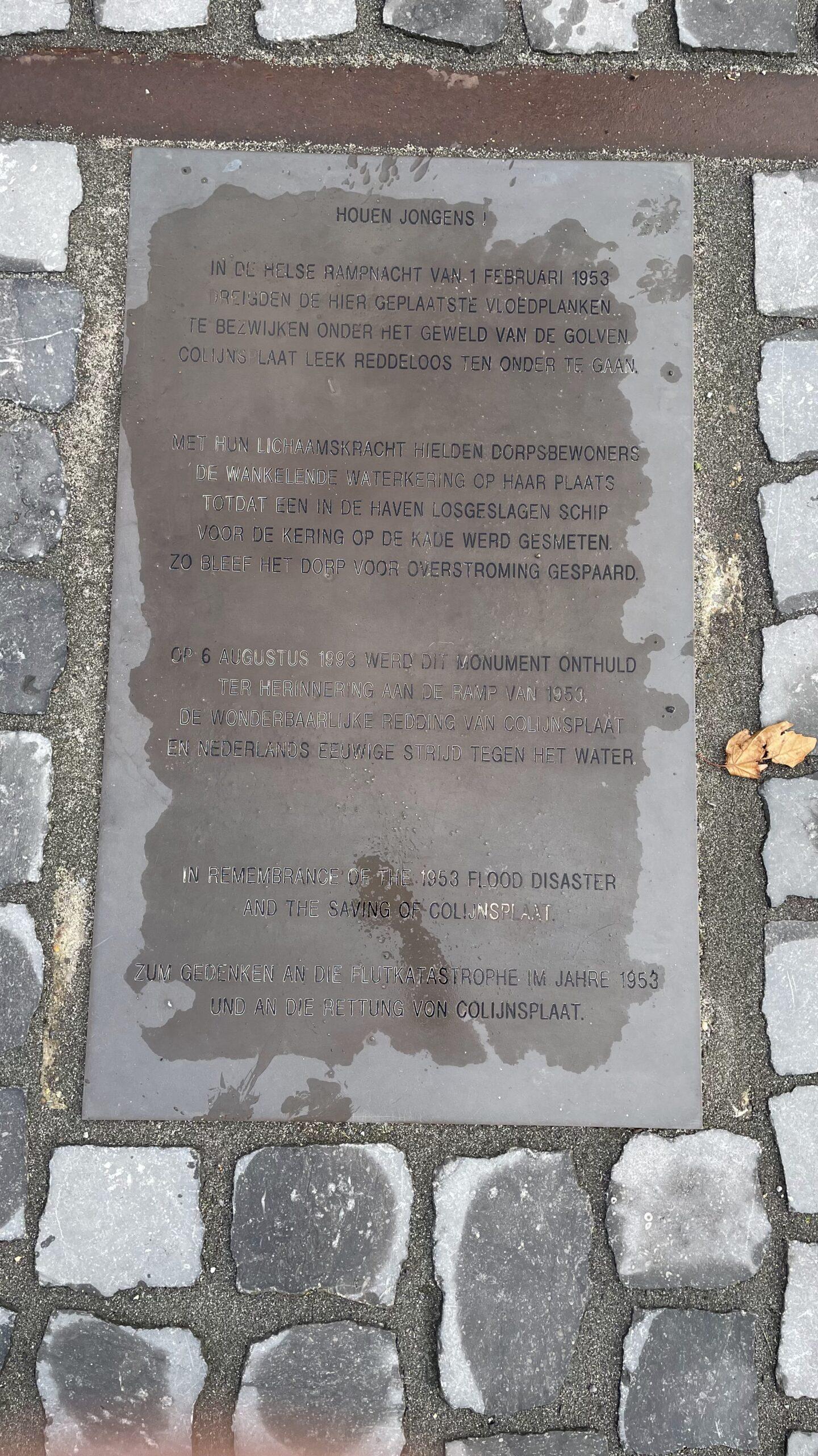 „In der Nacht vom 31. Januar auf den 1. Februar 1953 wurde die Niederlande von der Flutkatastrophe heimgesucht. Colijnsplaat blieb wie durch ein Wunder verschont. Der alte – heute zugeschüttete – Hafen war noch in vollem Betrieb und stand in Verbindung mit der Oosterschelde. In dieser Nacht stieg das Wasser so hoch, dass man beschloss, die Flutbretter in der Kluft neben dem ehemaligen Rathaus zu platzieren. Das Wasser stieg weiter. Die Wellen schlugen gegen die Flutbretter. Der mittlere Stützpfeiler konnte dem Druck des Wassers nicht standhalten und begann Risse zu zeigen und zu „wanken”. Anwesende Dorfbewohner (zwischen 30 und 60) kamen zu Hilfe und drückten gegen die Bretter und den Stützpfeiler. Jedes Mal, wenn eine große Welle aus dem Hafen heranrollte, stellten sie sich quer, um den Aufprall der Welle gegen die Bretter mit ihren Körpern abzufangen. Das Wasser stieg weiter bis etwa 10 cm unter die höchste Flutplanke. Nach einigen Stunden – als die meisten Männer erschöpft waren und den Mut zu verlieren drohten – kam unerwartete Hilfe aus dem Hafen. Das im Hafen liegende Schiff „Lead” wurde vom Meer auf den Kai geworfen, direkt vor die Unterbrechung, wodurch diese als Wellenbrecher fungierte.