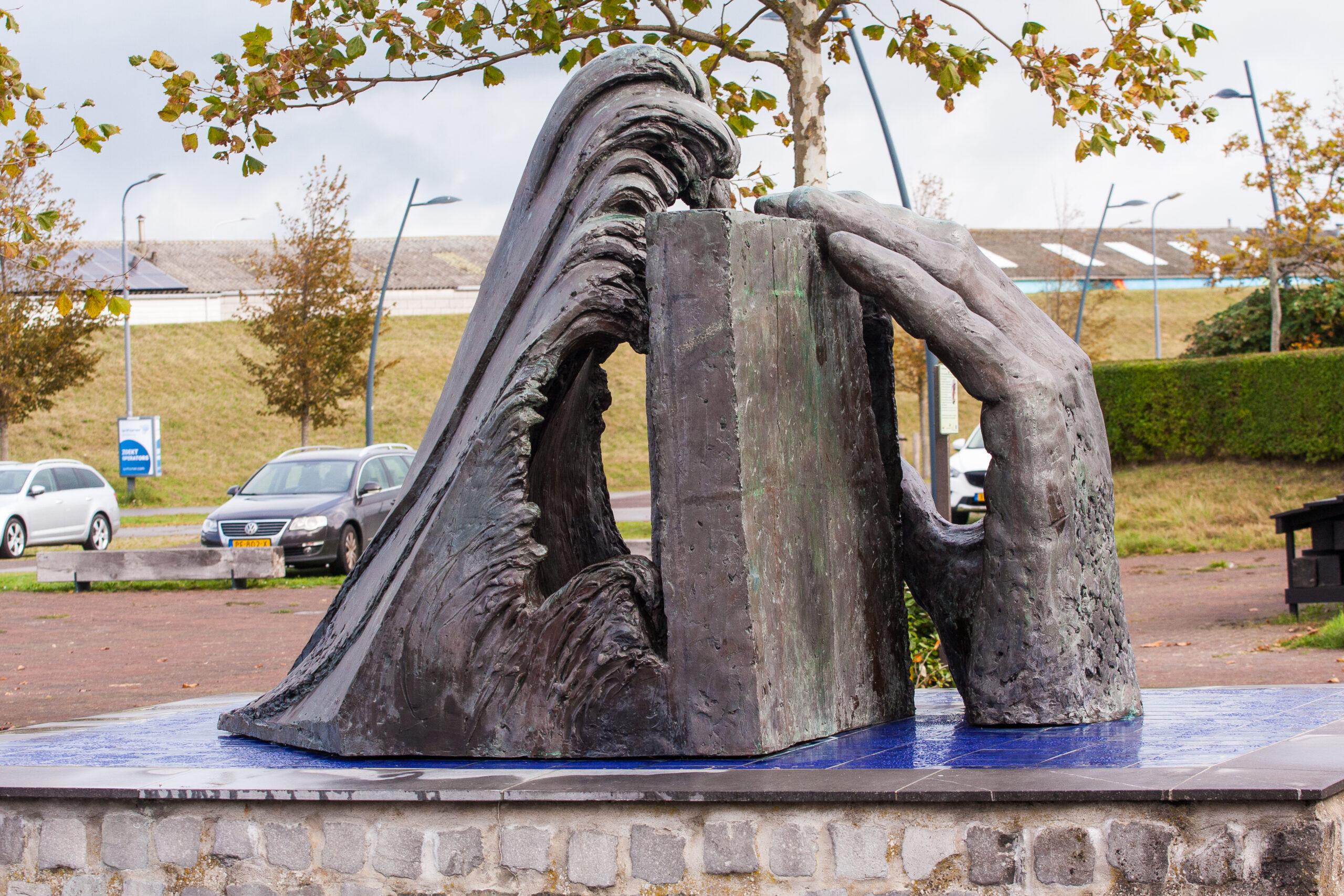 Es ist aus Bronze gefertigt und stellt „die heranrollende Welle, die Flutbretter und eine Menschenhand” dar und symbolisiert den Kampf des Menschen mit dem Wasser.